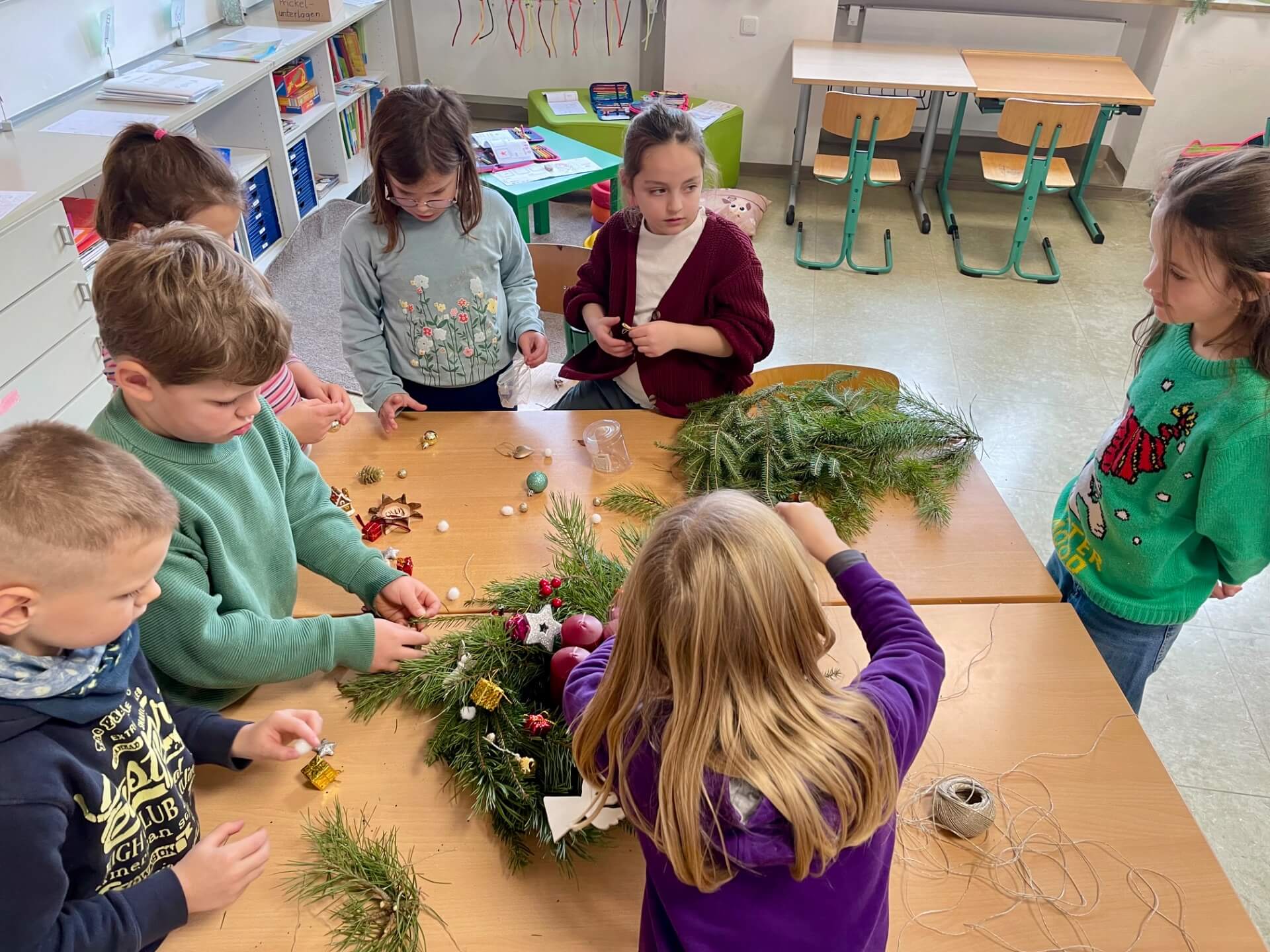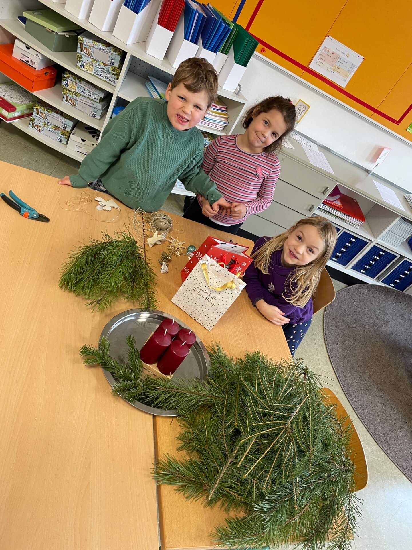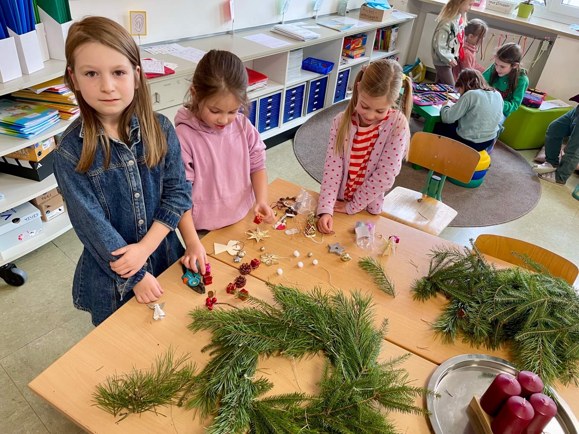 Die Klasse 1a gestaltete selbst einen Adventskranz. Jedes Kind brachte hierzu einen Zweig oder Weihnachtsdeko in die Schule mit. Gemeinsam wurde ein Kranz aus den Zweigen gebunden und mit den vielen bunten Anhängern dekoriert.