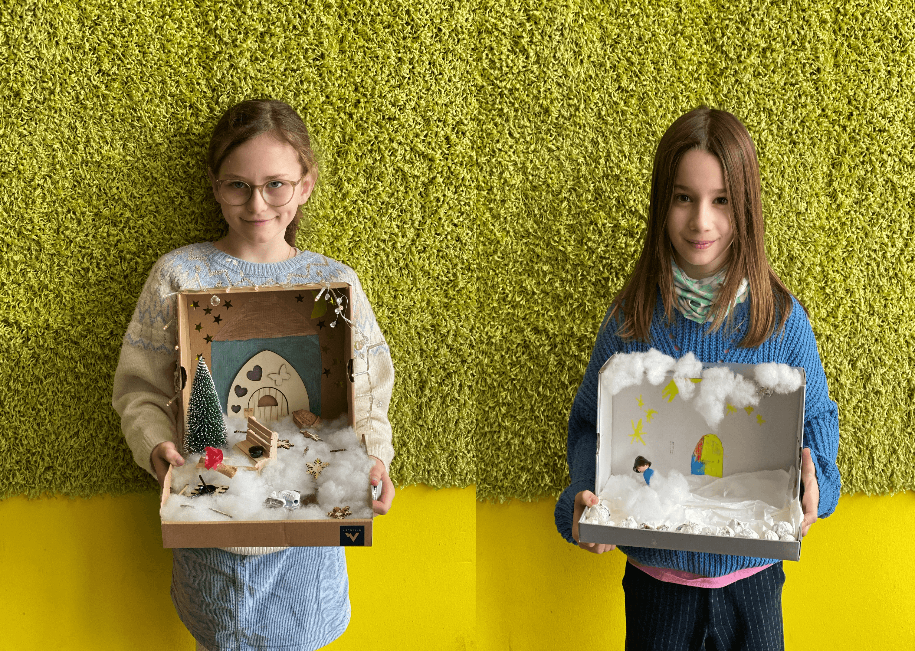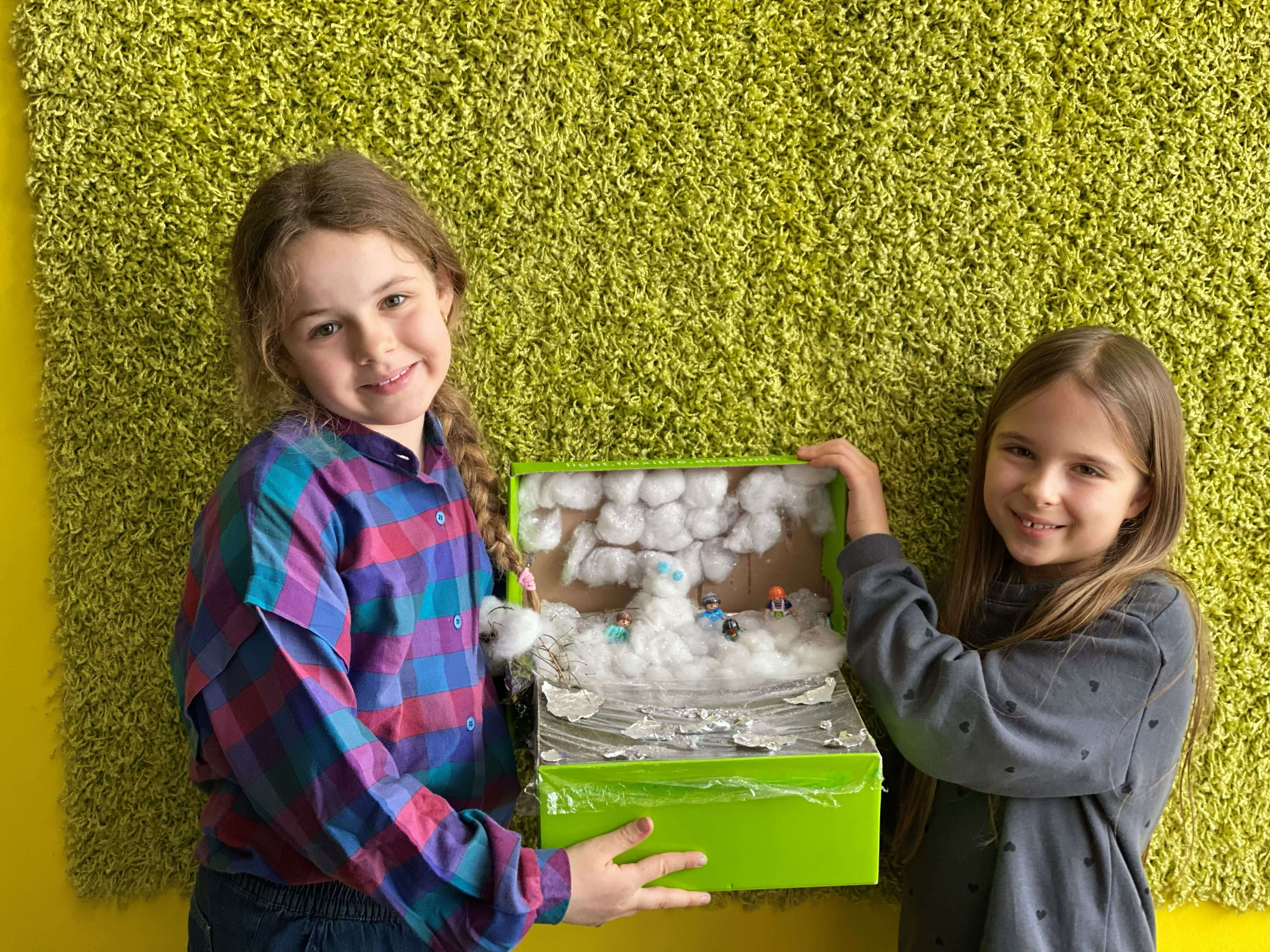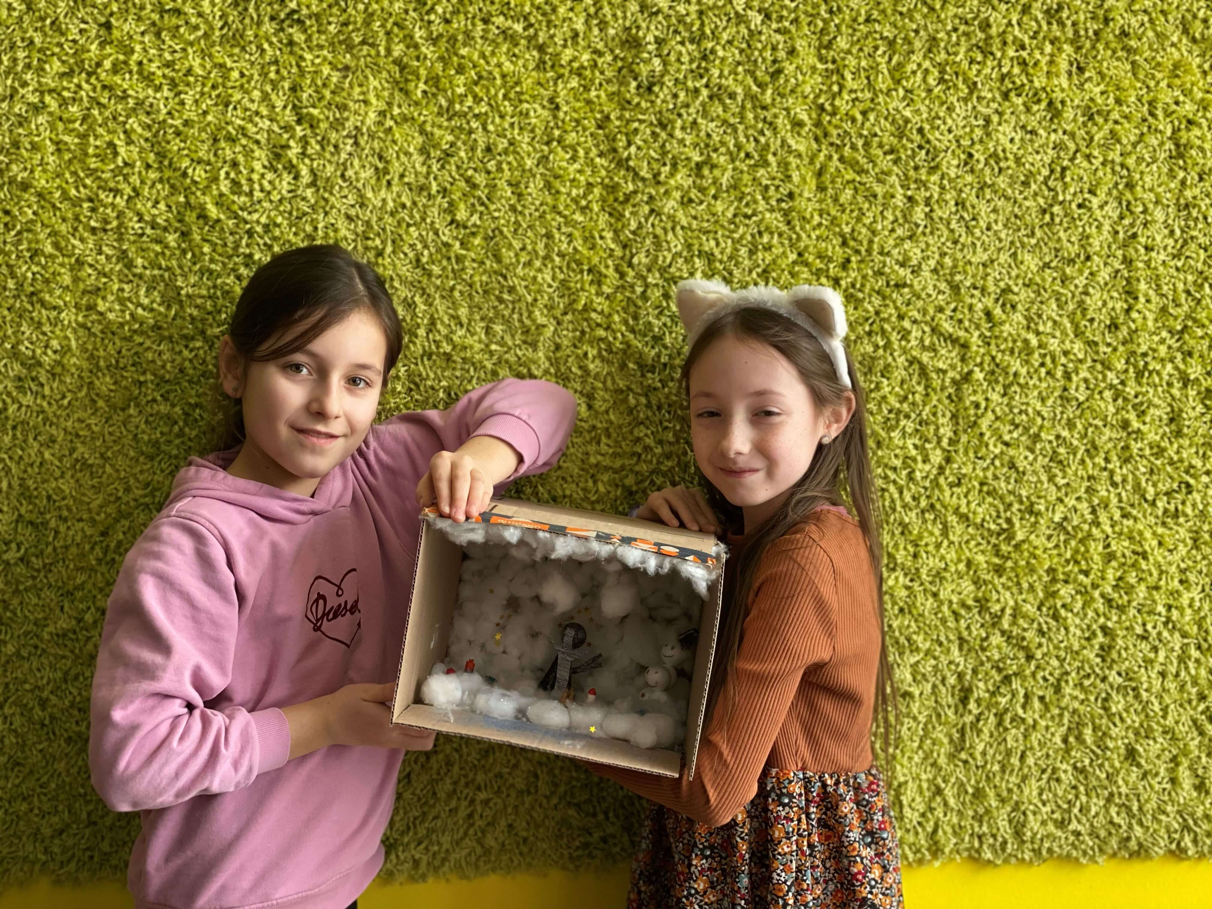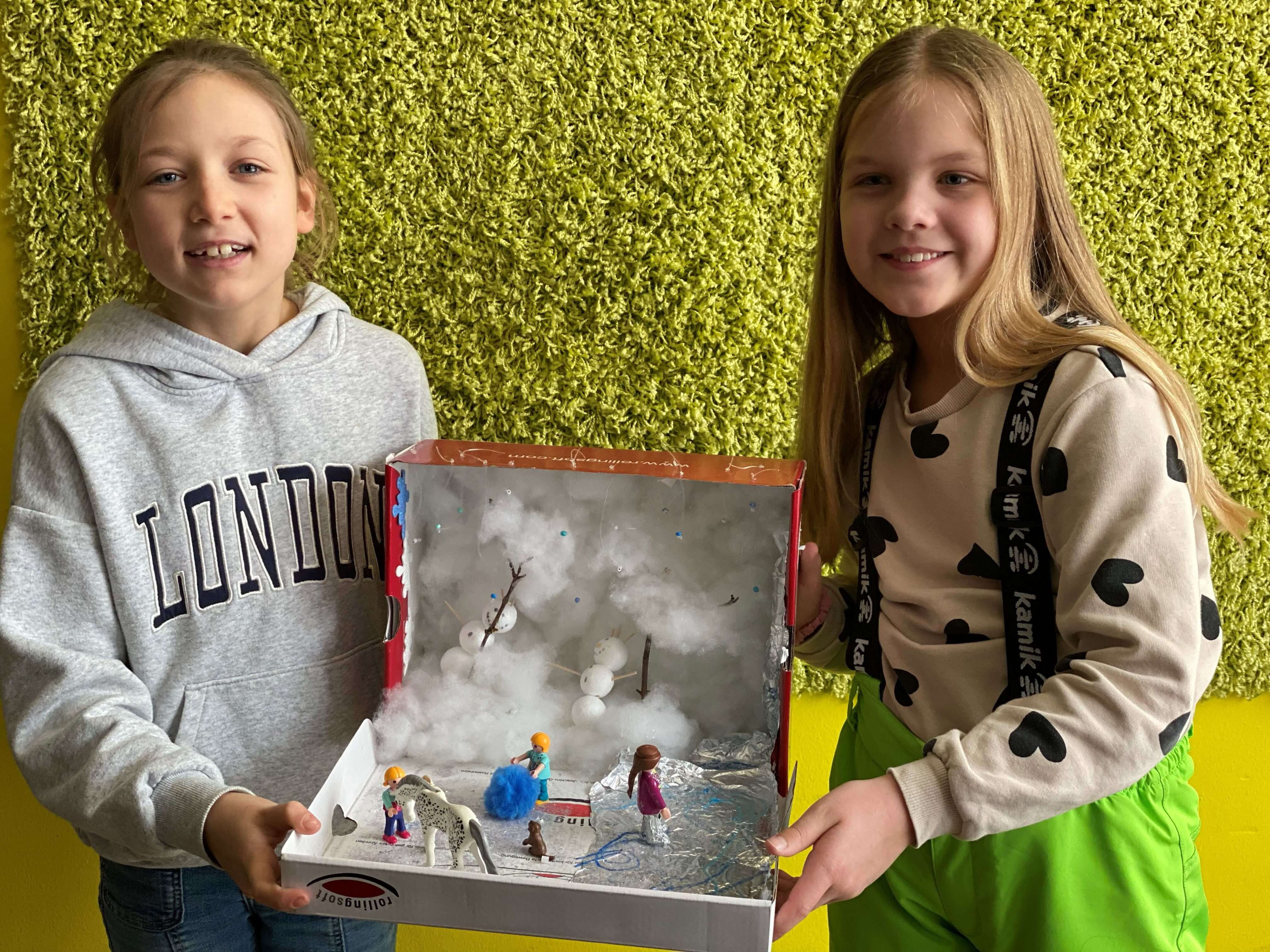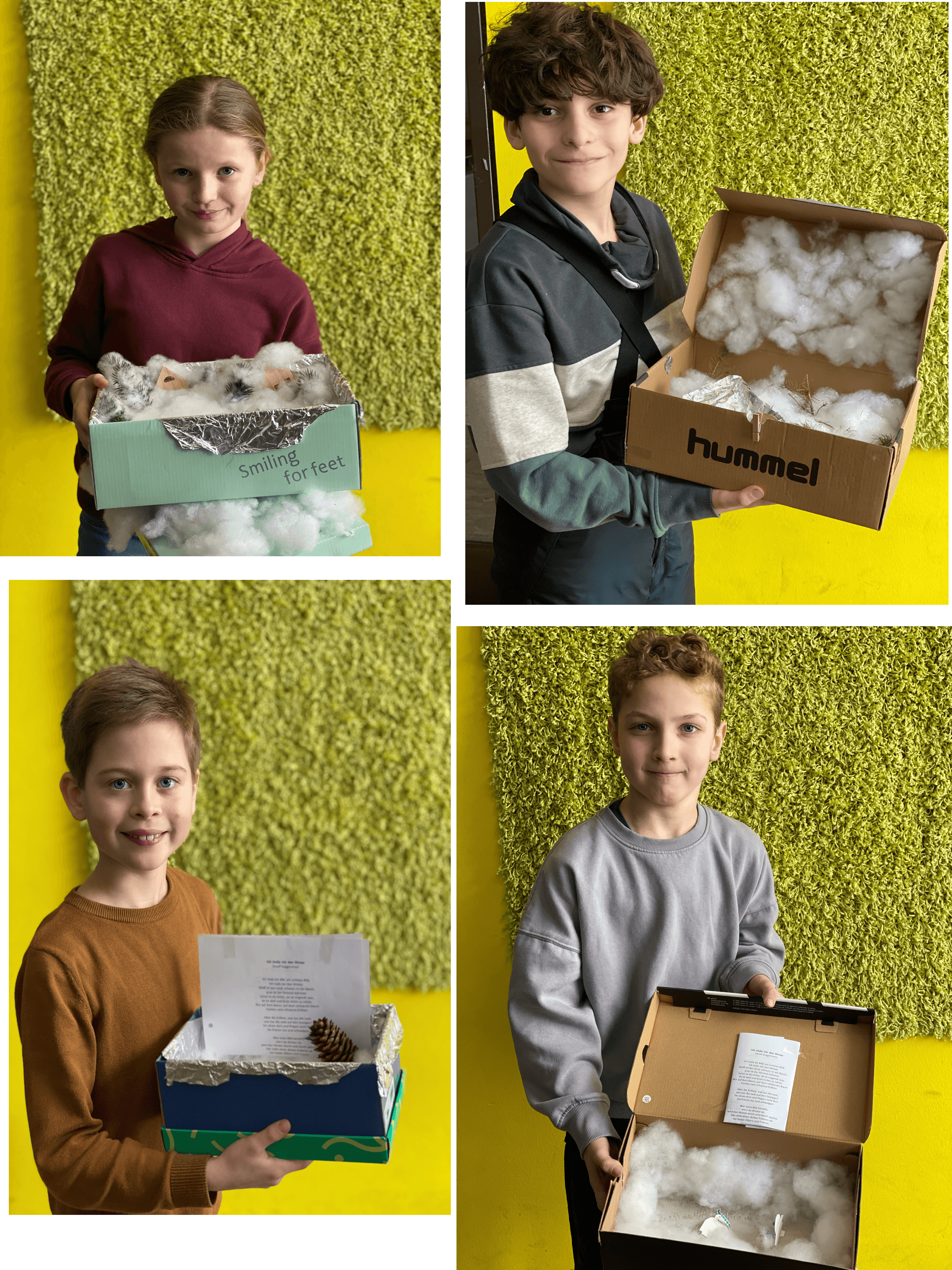 Die Kinder der AG„Schreibwerkstatt" haben in Zweierteams wunderschöne Winterkisten erstellt. Die Schüler wählten zunächst ein Wintergedicht aus (oder schrieben sogar selbst eines) und gestalteten einen Schuhkarton, der die Stimmung ihres Gedichts auf kreative und stimmungsvolle Weise zum Ausdruck bringt.