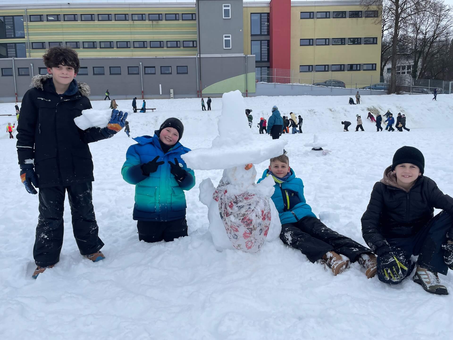 Leider waren die Schneeverhältnisse am Tag unserer Pausenaktion "Wir bauen 50 Schneemänner und Skulpturen", nicht ganz optimal. Fester gefrorener Schnee, aber unsere Schülerinnen und Schüler waren dennoch hoch motiviert und zauberten tolle Skulpturen, Tiere und Schneemänner. Viele hatten Karotten, Schals und Mützen dabei um lustige Gesellen zu bauen. Die Stunde an der frischen Luft war für alle eine schöne Abwechslung zum Schulalltag, mit kreativen Ergebnissen.