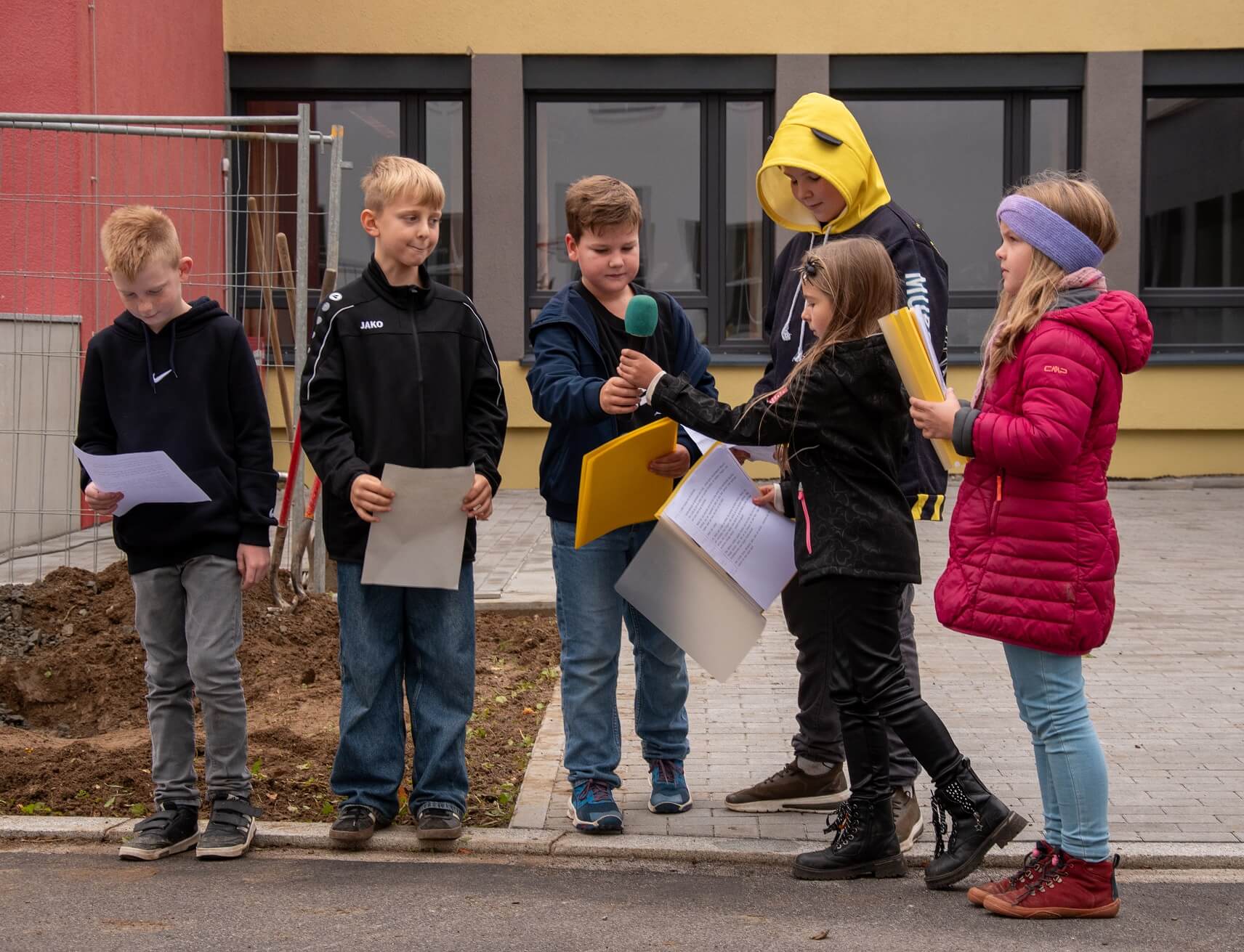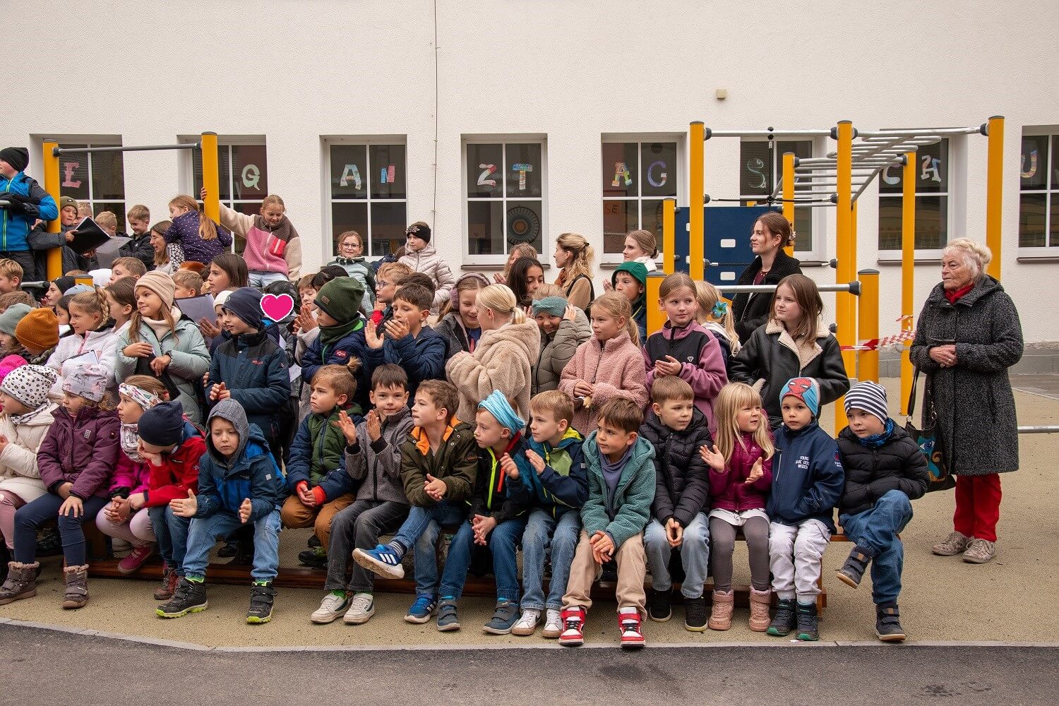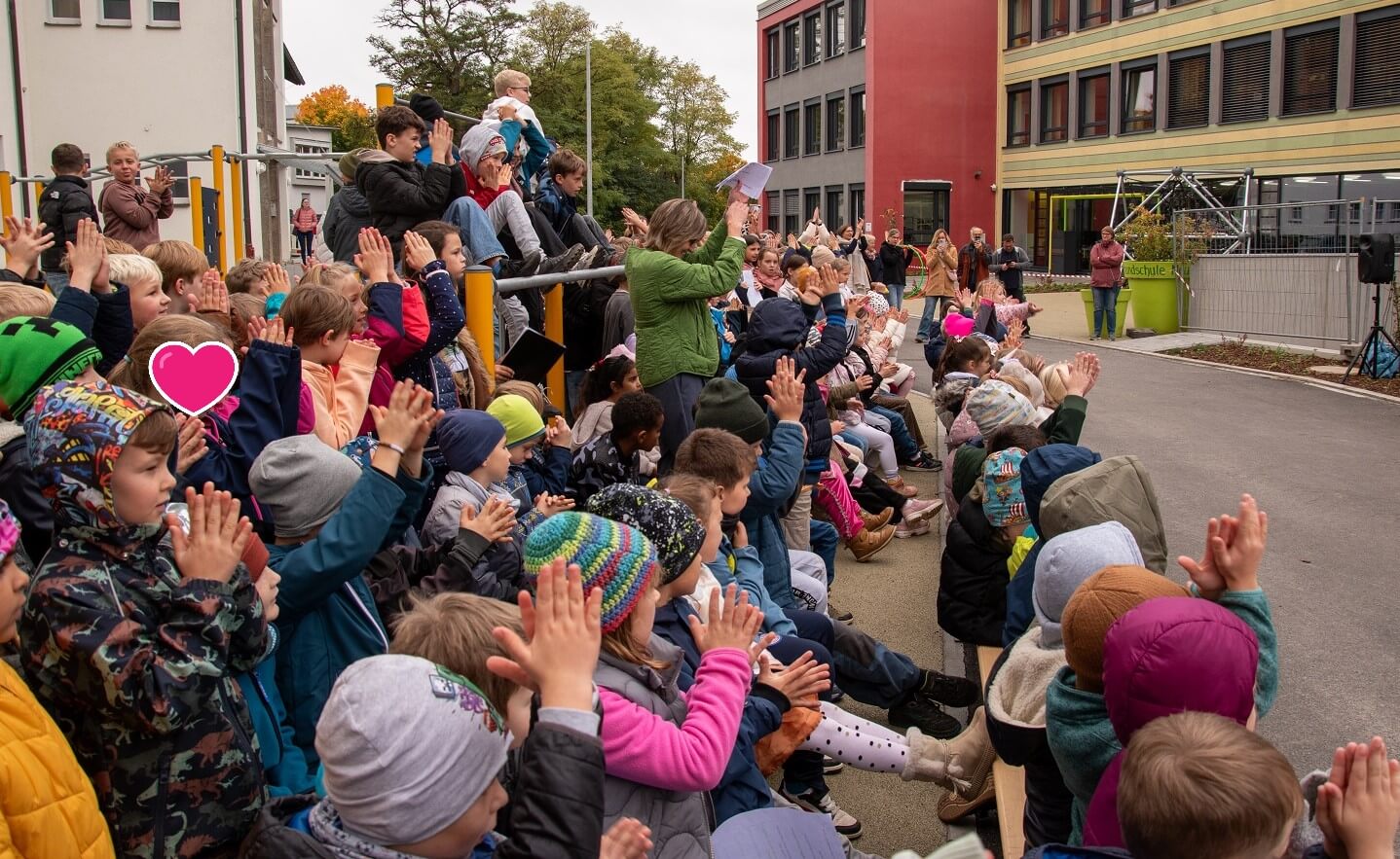 Alle Kinder, Lehrer, Vertreter des Elternbeirats und Fördervereins unserer Grundschule haben sich am Pausenhof versammelt und waren sehr aufgeregt. So lange haben wir der Eröffnung entgegengefiebert! Die Viertklässler haben sogar schon vier lange Jahre auf diesen großen Tag gewartet.