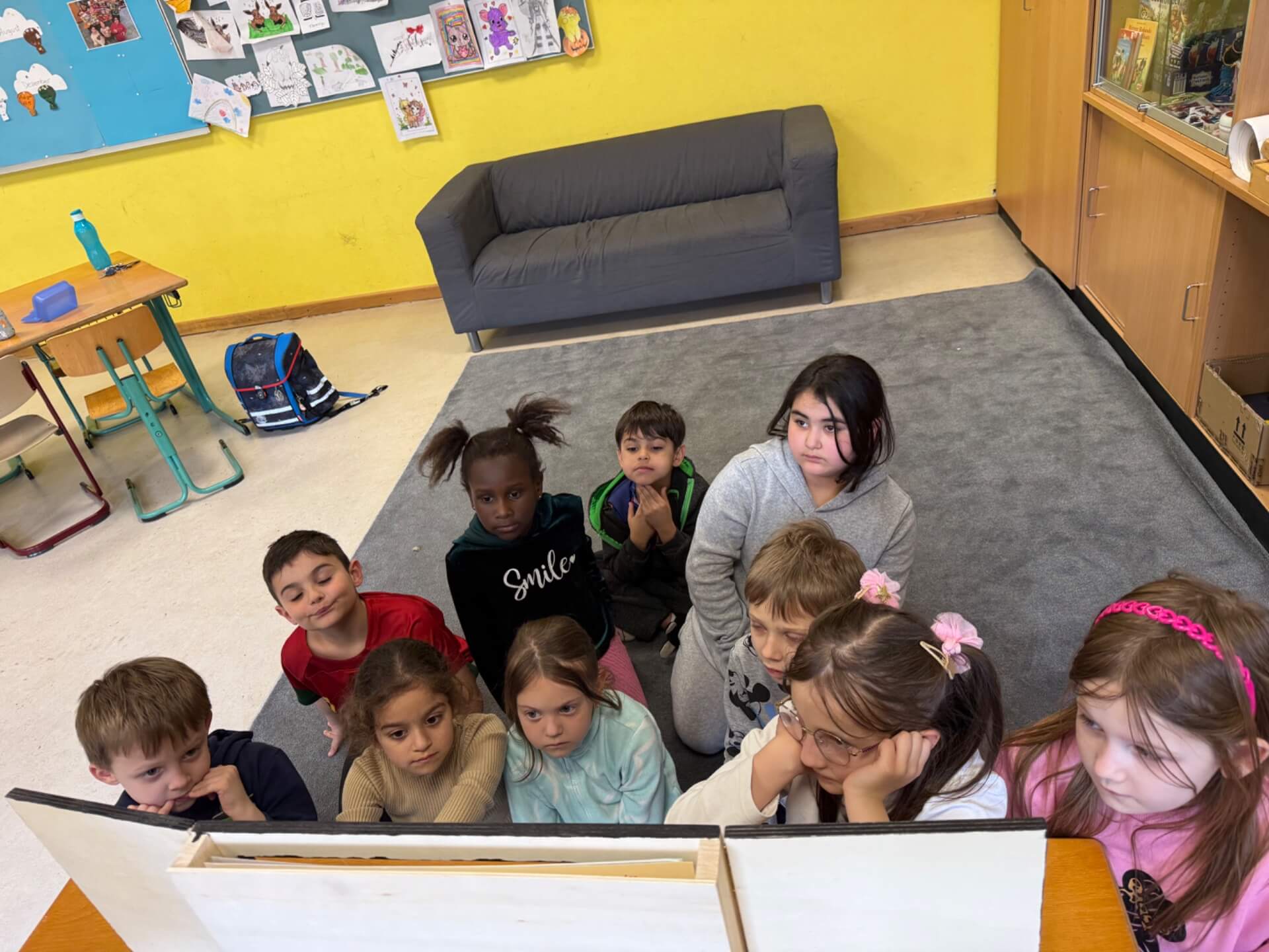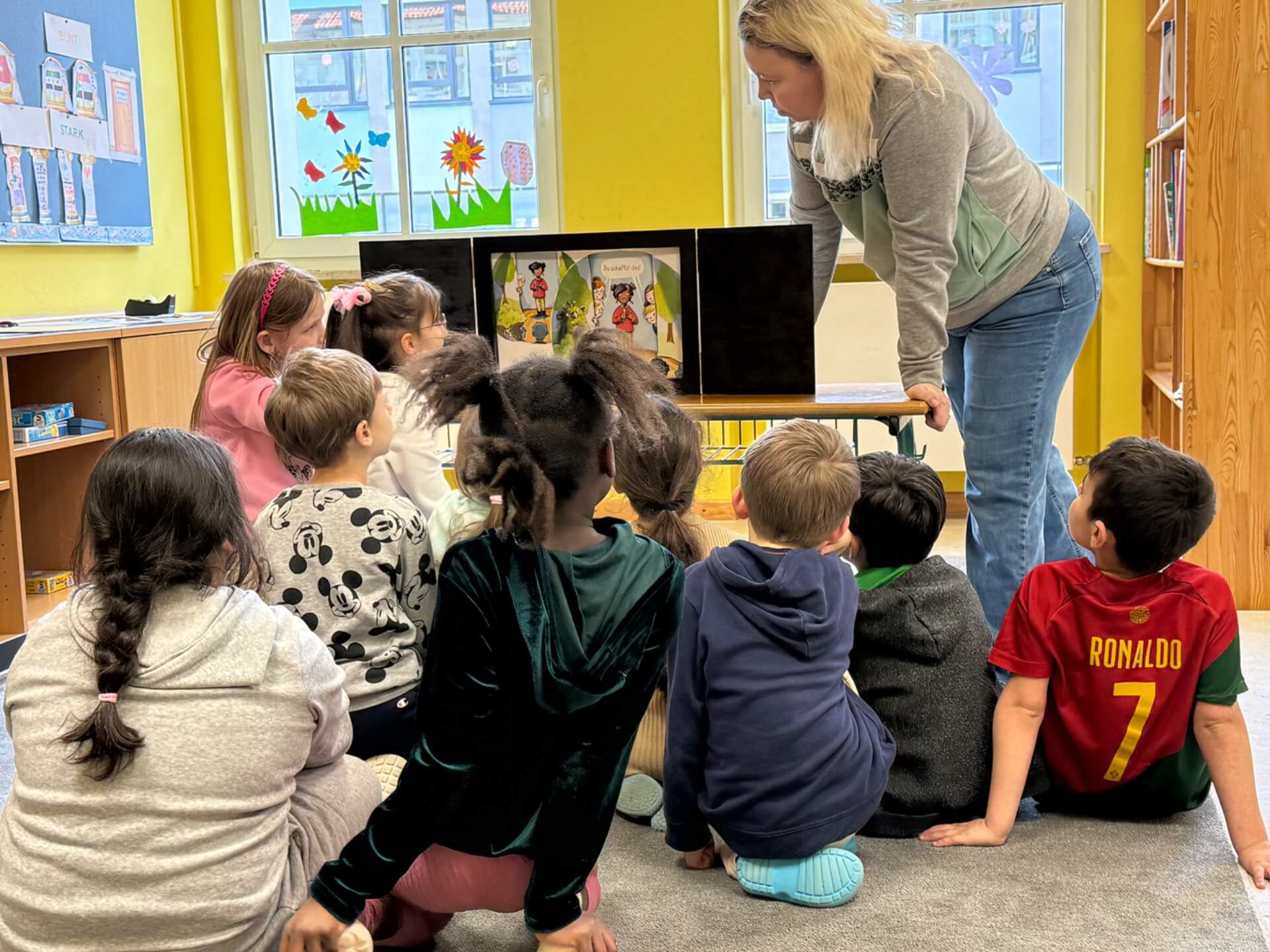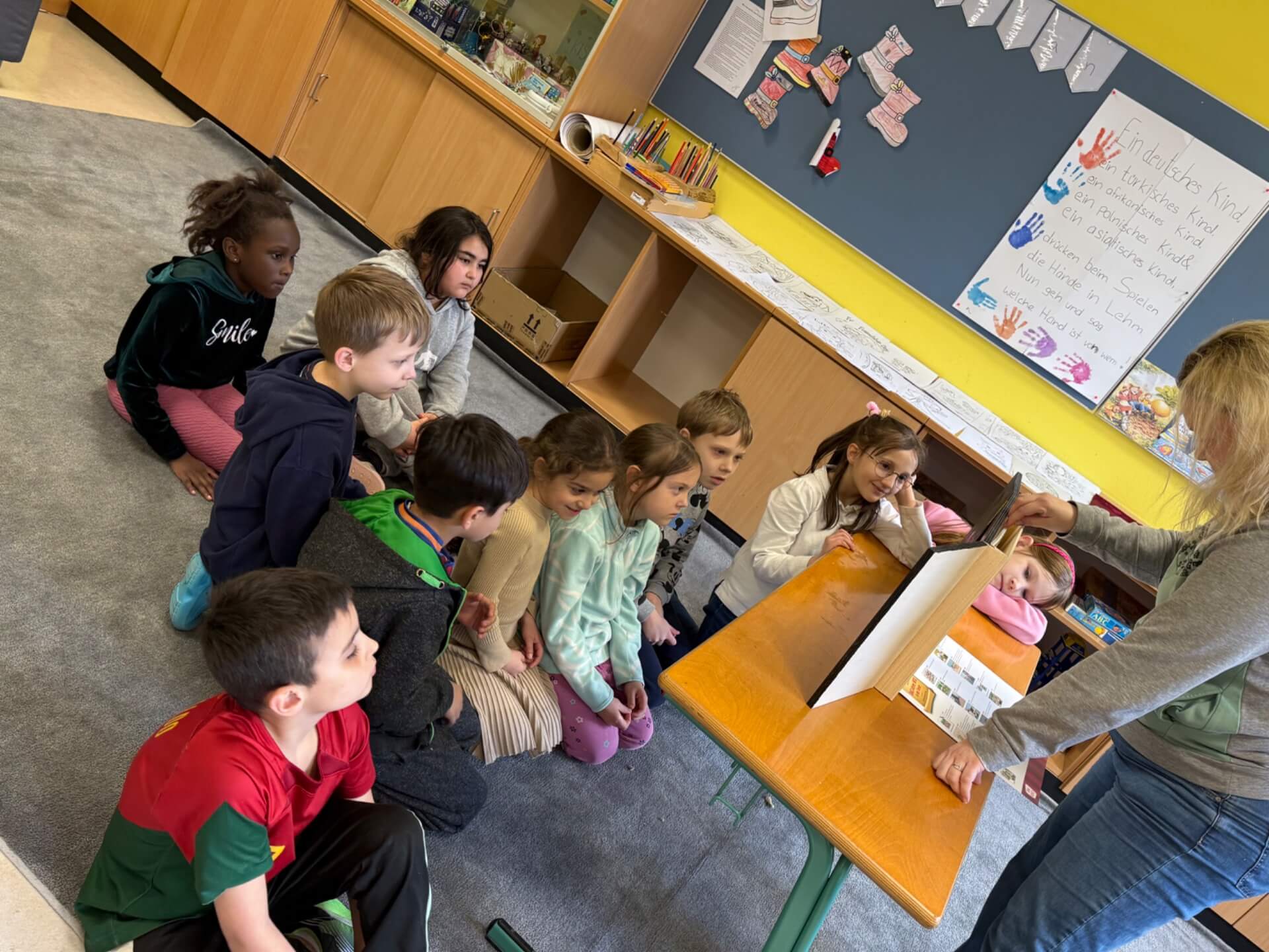Im Rahmen ihrer Facharbeit führte Claudine in ihrer Gruppe (erste Klasse) ein Kamishibai- Erzähltheater zum Thema "Das kleine WIR in der Schule" durch. Mithilfe bildgestützten Erzählens wurde den Kindern vermittelt, wie wichtig Zusammenhalt und ein respektvoller Umgang miteiander sind. Die Geschichte zeigte anschaulich, dass das "WIR" durch freundliche Worte und gute Taten wächst, während es druch negative Verhaltensweisen kleiner wird. Dabei wurde auch das Thema Mobbing kindgerecht aufgegriffen. Die Schülerinnen udn Schüler beteiligten sich begeistert und kannten das Angebot teilweise bereits aus dem Kindergarten. Insgesamt war dies eines von drei Projekten, die Claudine im Rahmen ihrer Facharbeit umsetzte.