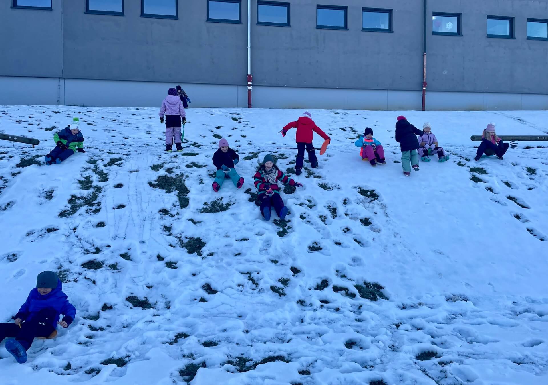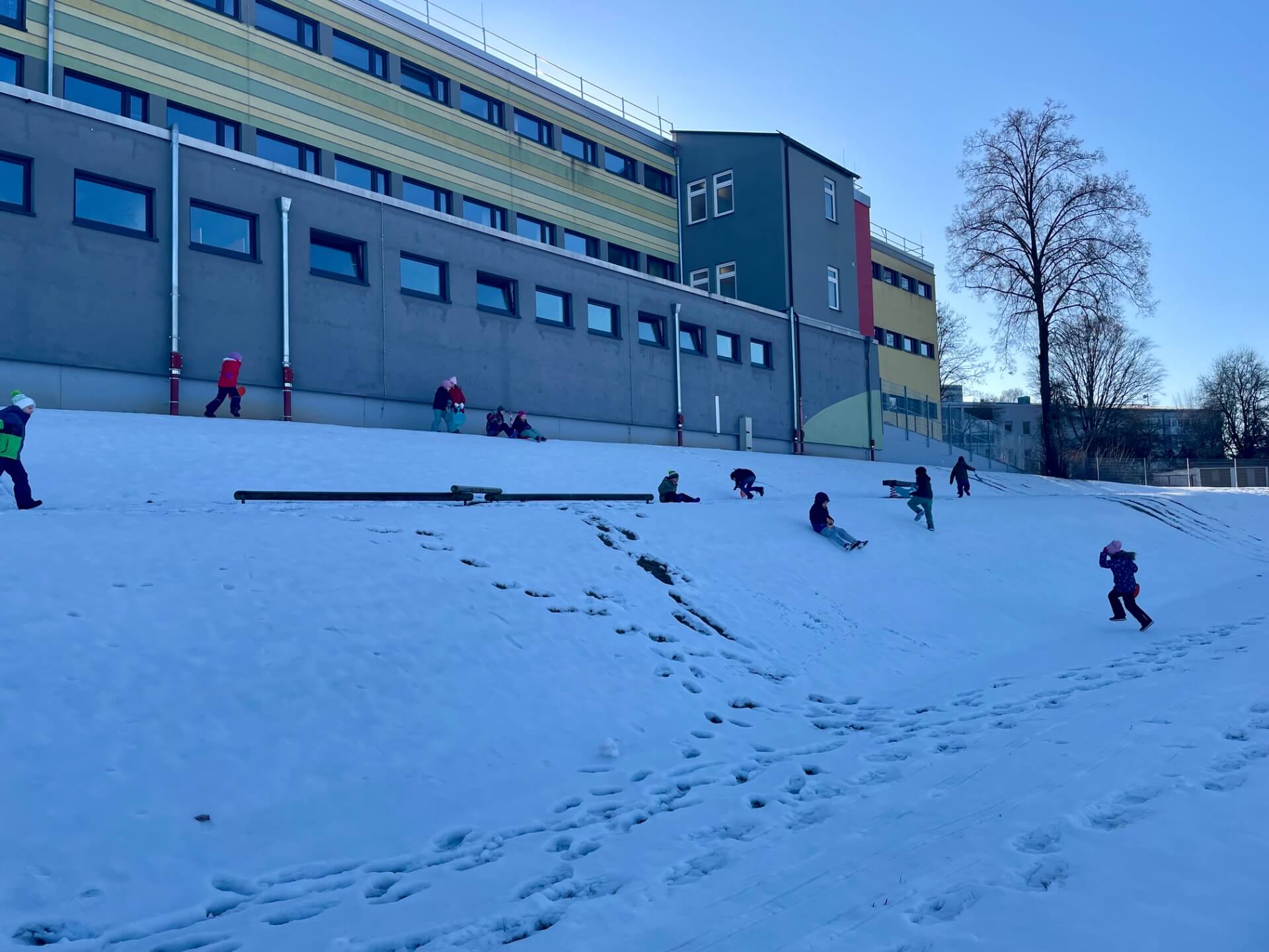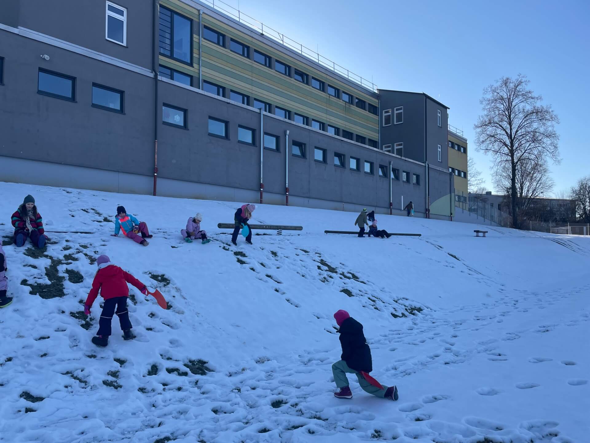 Das winterliche Wetter wurde von der Klasse 1a genutzt, um am Sportplatz die Hügel hinunter zu sausen. Das war ein Spaß!